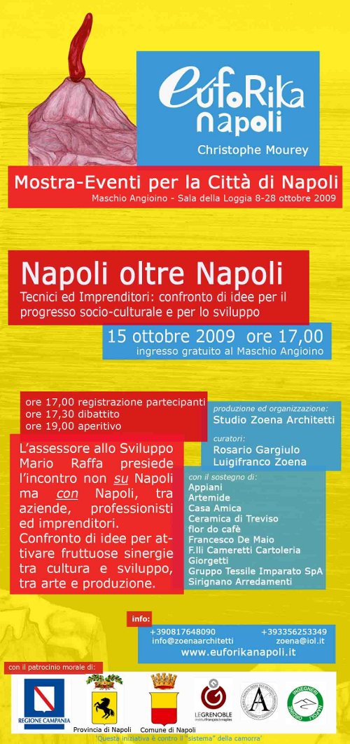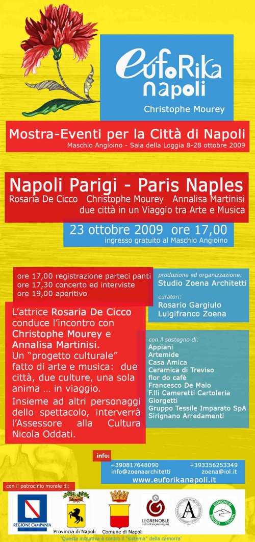E dunque la mostra “Euforika Napoli” è proprio un racconto di emozioni attraverso luoghi e dettagli di una città che appare agli occhi dell'osservatore attento come essenzialmente euforica. Di qui il titolo "Euforika Napoli": Napoli è euforika nel senso greco dell'"io porto bene" come compenetrazione di anima e corpo, di sostanzialità e forza volitiva, ma anche moto di ribellione furente. L'intento è di sottolineare sin dall’inizio le caratteristiche preponderanti della città, come l'effervescenza e l'inesauribile creatività che l'artista non ha trovato a Parigi, Milano e neanche a New York: “Napoli è una cittàche rivela sorprese dietro ogni angolo,” - confessa Mourey -“paragonabili a dei graffi agliocchi”.