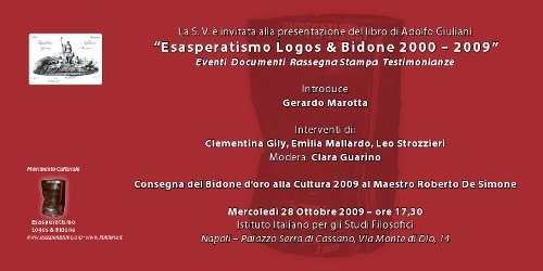 Mercoledì 28 ottobre alle ore 17,30 presso l’Istituto Italiano per gli Studi Filosofici, a Palazzo Serra di Cassano, in via Monte di Dio 14, a Napoli, sarà presentato il libro di Adolfo Giuliani “Esasperatismo Logos & Bidone 2000-2009; Eventi Documenti Rassegna Stampa Testimonianze”. Introduce Gerardo Marotta; interventi di Clementina Gily, Emilia Mallardo e Leo Strozzieri; modera Clara Guarino.
