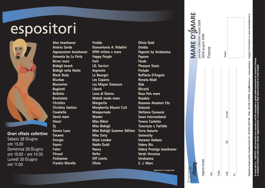 Organizzazione generale: Associazione Immaginecolore.com Curatrice della mostra: Loredana Trestin Sede espositiva: Villa Serra Via Carlo Levi, 2 Comago - 16010 Sant'Olcese (Genova) Periodo mostra 14 al 29 giugno 2008 Vernissage: 14 giugno 2008 ore 17