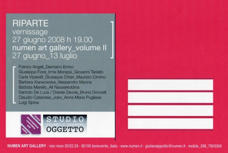 Riparte 3, ultima fermata di un progetto editoriale, curato da Pasquale de Simone, presidente di Nuova Associazione Casertana Arti Visive, che ha inaugurato a gennaio 2008 Riparte 1/ Riparte2, in preparazione alla celebrazione dei quarant’anni della galleria Studio Oggetto Caserta/Milano di Massimo de Simone, gallerista dal grande intuito che ha portato l’arte oltre le mura delle sue gallerie esponendo a Roma negli anni ’70 , a New York nel 1991, a Bruxelles nel 2001, opere di giovani ed opere di artisti consacrati come Beuys, Duchamp, Kosuth, Urs Lùthi, Turcato, Dine, Costa, Pistoletto,Warhol, Chiari, Paladino.